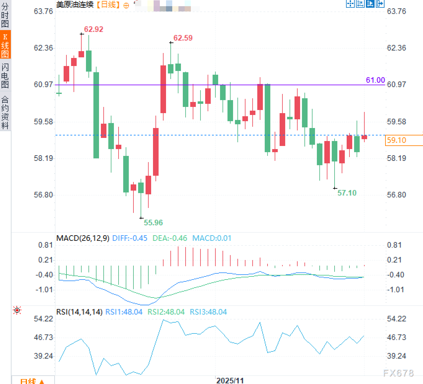 价格在接近61美元的水平时遇到一定的压力,这可能成为短期的阻力位。与此同时,55.96美元和57.10美元则构成较强的支撑区域,这些价位的突破可能会影响后续的价格走向。总体来看,短期内原油价格可能会在区间内整理,需关注突破61美元或55.96美元的关键价位,以判断未来的方向性走势。